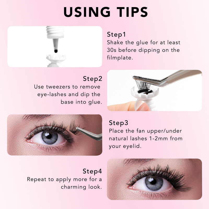 Proses aplikasi cepet lan gampang. Miwiti kanthi milih kluster lash sing dikarepake lan dilebokake ing permukaan sing rata. Banjur, aplikasi jumlah lem kluster DIY DIY menyang dhasar saben kluster. Ngidini lem kluster DIY garing nganti garing nganti sawetara detik banjur tekan kluster menyang lashes alami sampeyan.